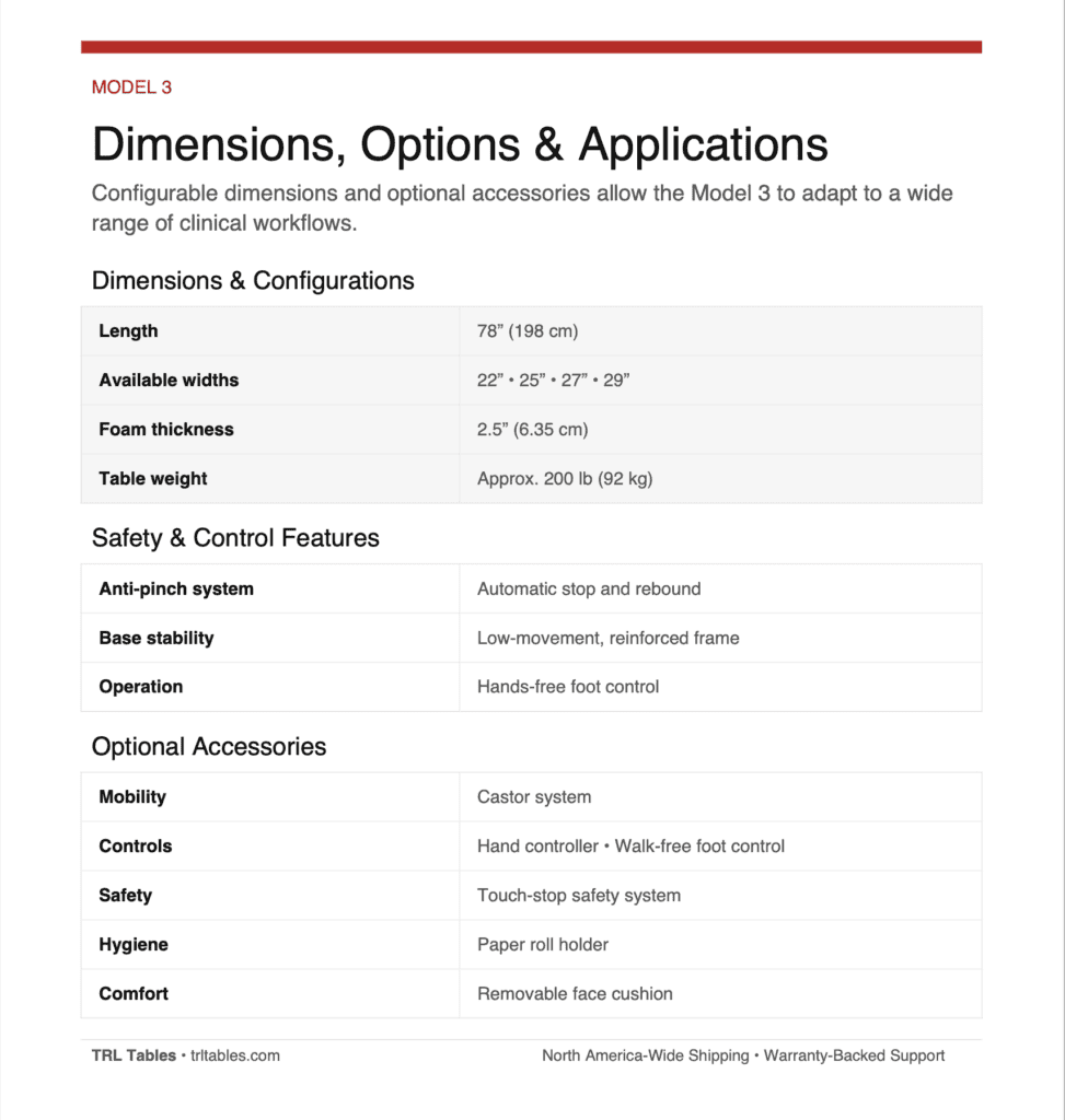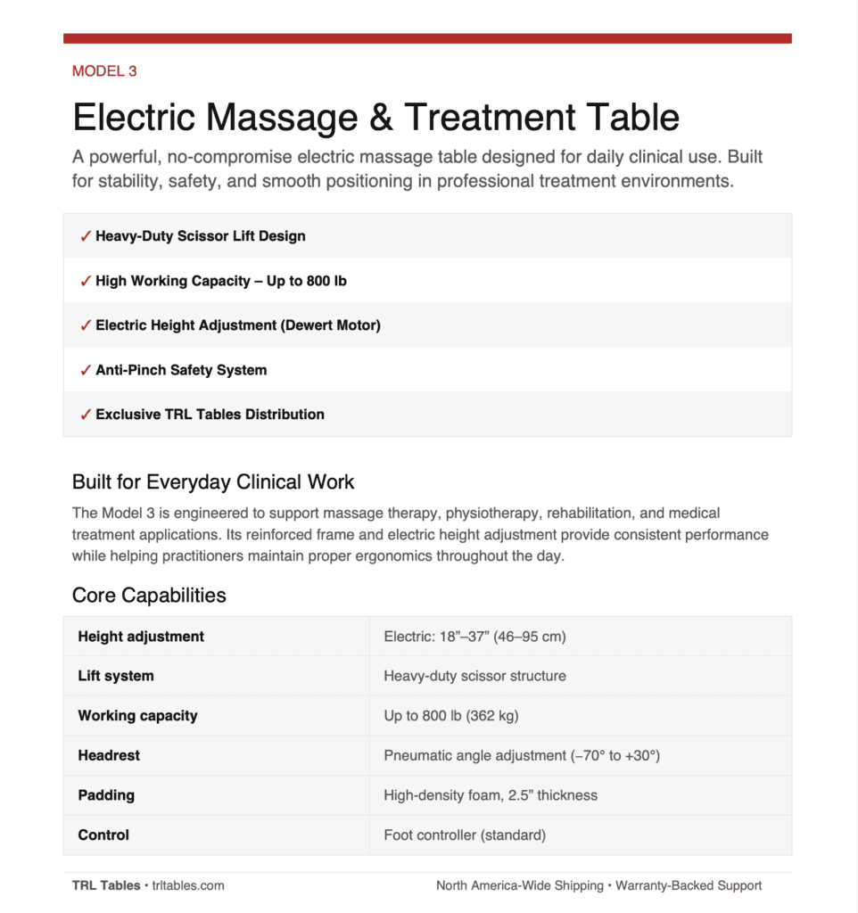 The Model 3 Basic is a high-quality, 2-section treatment table designed for massage therapists, physiotherapists, and other wellness professionals. It offers sturdy construction, smooth adjustments, and a streamlined design for everyday clinical use.