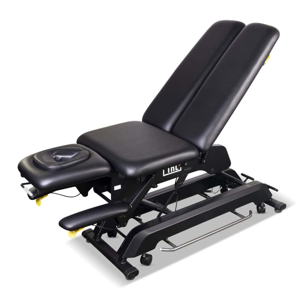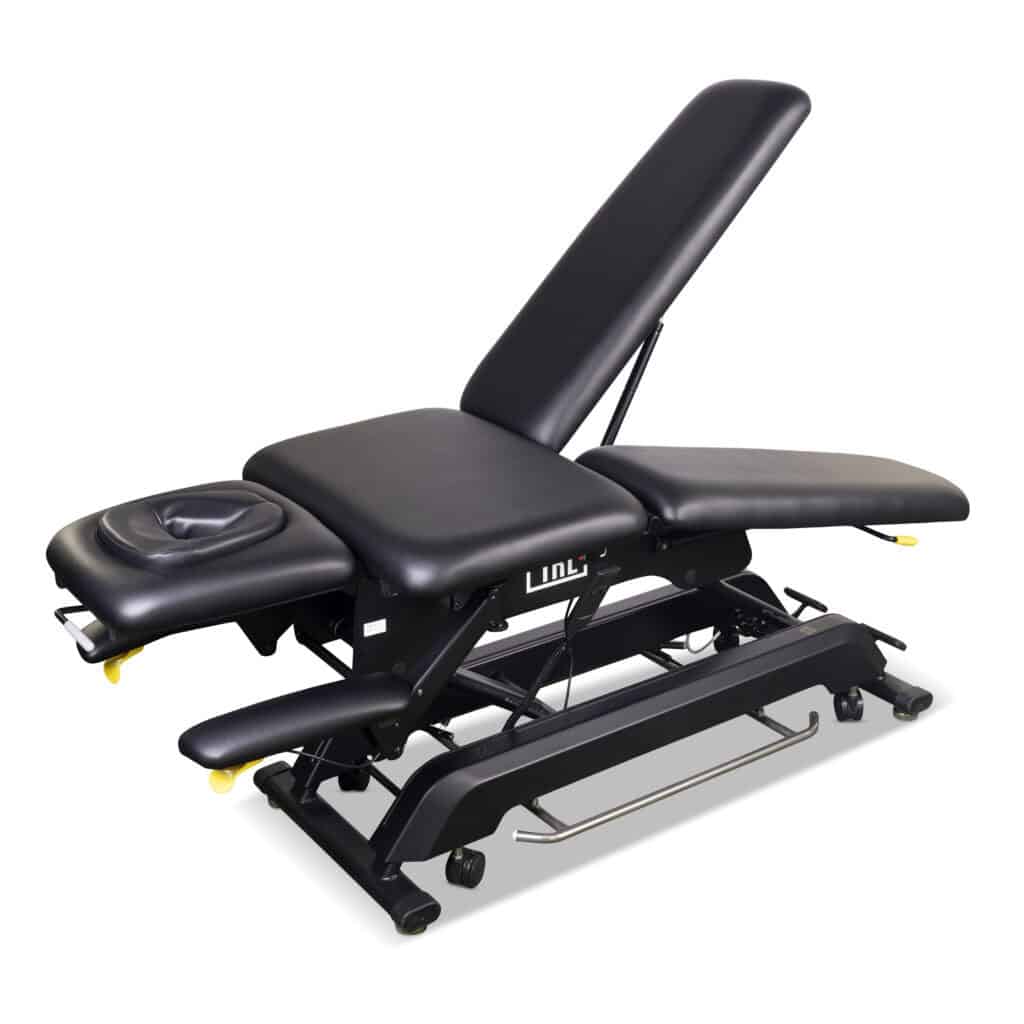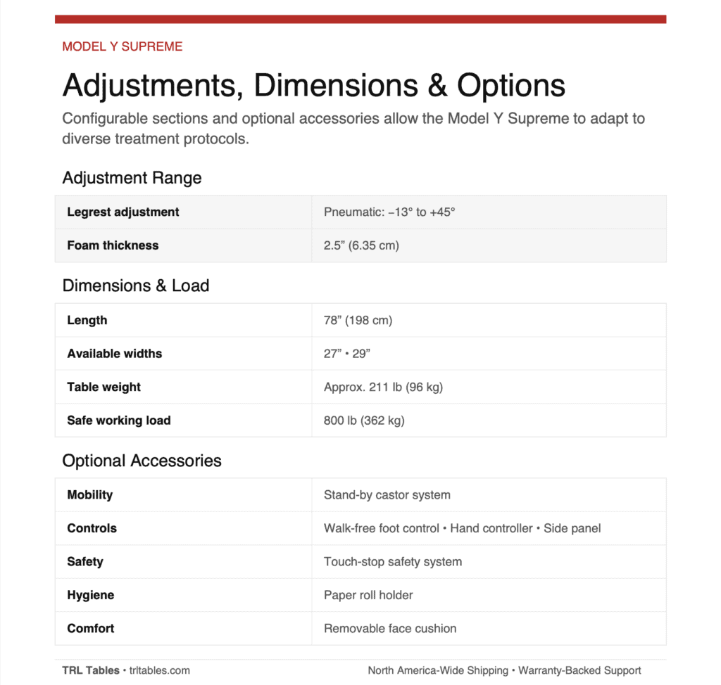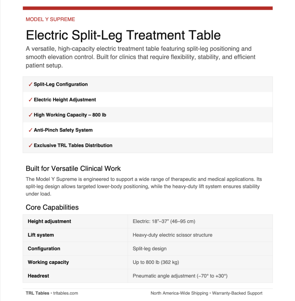 The split-leg design allows practitioners to position patients precisely for targeted lower-body treatments, assessments, and therapeutic techniques. Combined with electric height adjustment and pneumatic section control, the Model Y Supreme enables efficient workflows while maintaining ergonomic working positions.