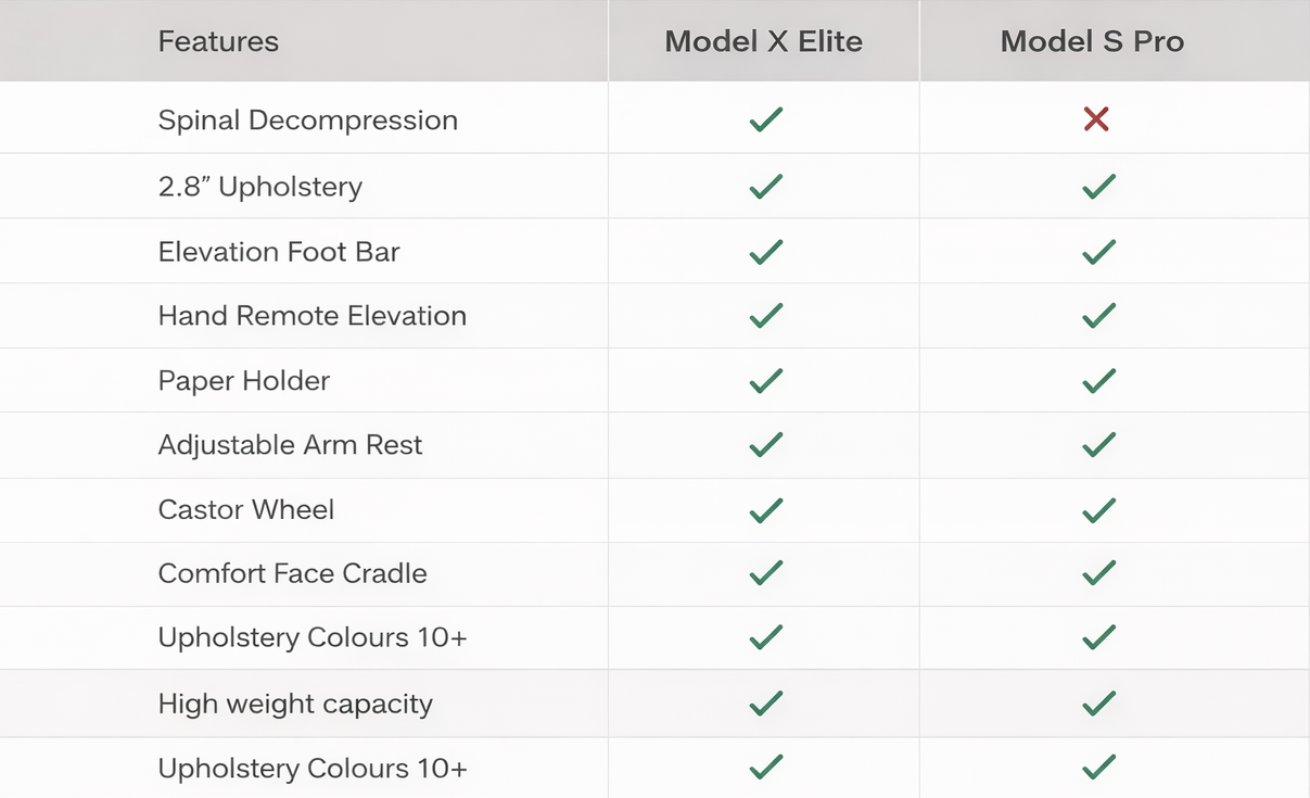 A premium electric treatment table engineered for advanced positioning, superior stability, and modern clinical workflows. The Model X Elite delivers multi-point electric adjustment with refined control.✓ Electric Height + Mid-Lift Adjustment